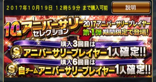 恒例になってきましたガチャ結果記事です 今回は、[2017プロスピセレクション第1弾] セレクションカーニバル 限定のSランク選手がゲットできる待望のガチャです! ただ、ちょっと調整ミスって回すのに必要なエナジーが10連1回分しかなかったので迷いましたね…